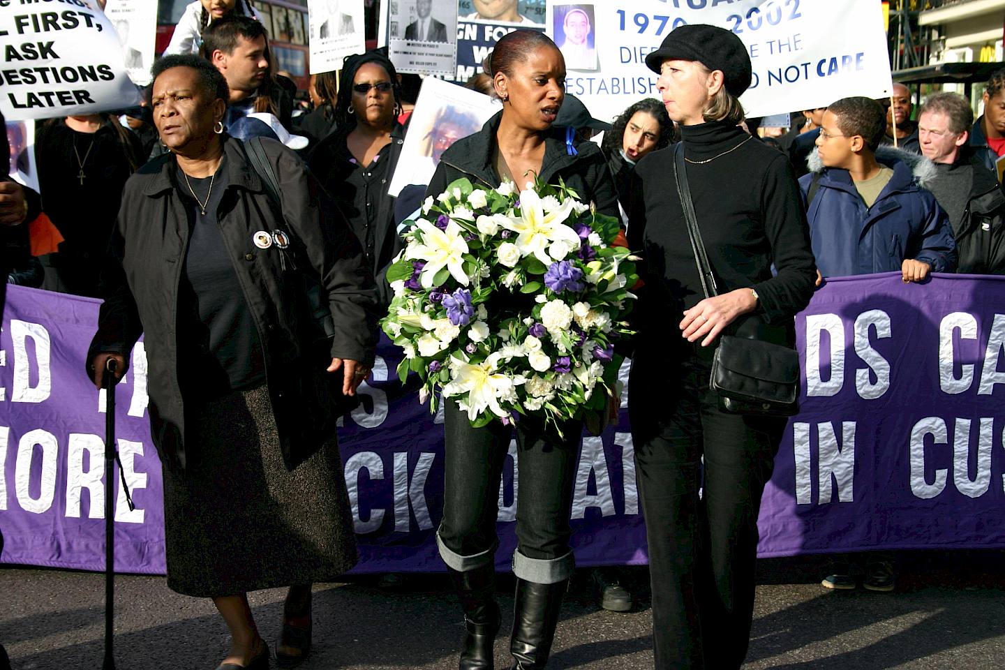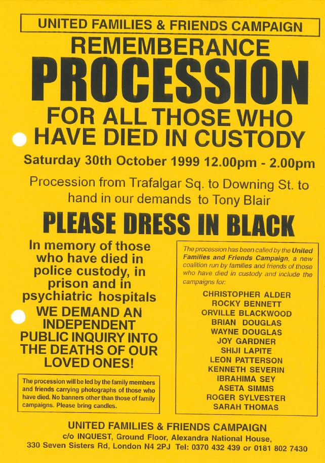 The 1999 remembrance procession was not UFFC’s first public action. In 1998 UFFC picketed a conference called ‘Deaths in Police Custody: Reducing the Risks’ that was organised by the Police Complaints Authority (an earlier iteration of the Independent Office for Police Conduct). The PCA invited all stakeholders apart from families, claiming that the ‘families would be too emotional’.[2]