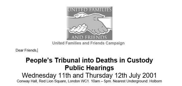 UFFC began as a coalition of Black people whose loved ones died in police custody, prison or ‘psychiatric’ hospitals. According to their first newsletter (22 June 1998), the families and friends of Orville Blackwood, Brian Douglas, Joy Gardner, Shiji Lapite and Ibrahima Sey began meeting with the intention of ‘building a network for collective action’ to stop the ‘current pattern of institutionalised racist killings’.[1]