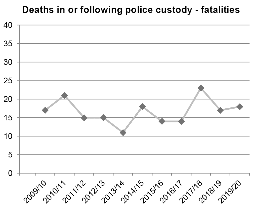 The latest data from the IOPC reports there were 19 deaths in or following police custody in 2020-21, an increase of one from the previous year. The IOPC figures on deaths in or following custody do not include all deaths following police contact, including some deaths where police restraint was used.