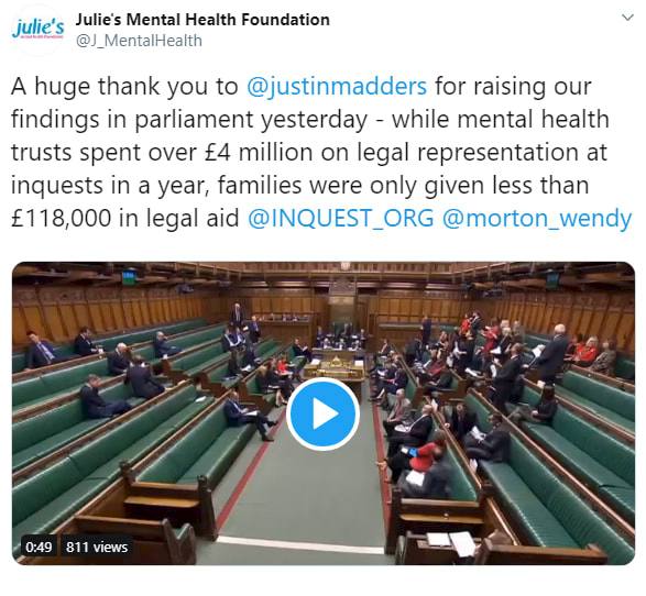 Justin Madders MP asked the minister for legal aid, Wendy Morton MP about the inequality of resources faced by families at inquests drawing on the data we released with Julie’s Mental Health Foundation last week.