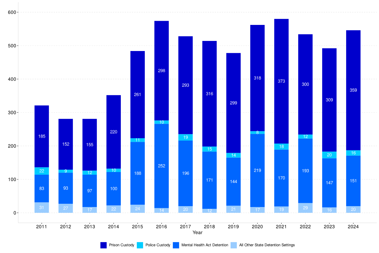 Coroners statistics, published today by the Ministry of Justice provide a summary of annual data on deaths reported to coroners.In 2024, 546 deaths in state detention (including deaths of those released from custody within 7 days and residents of probation approved schemes) were reported to coroners, compared to 492 deaths in 2023. The increase was driven by a 16% rise in deaths of people in prison.